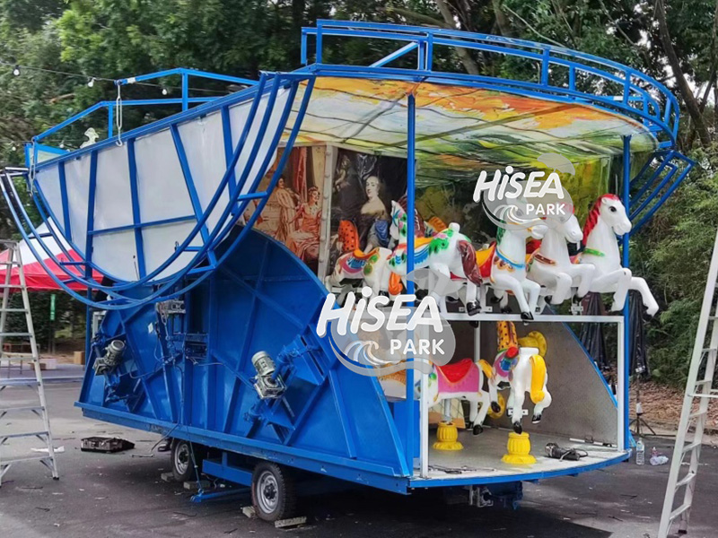 This mobile carousel is installed on a trailer, its chassis and roof can be folded, which greatly shortens the time of each installation and disassembly and makes it easy to move. Popular with fair business, rental owner, carnival etc.